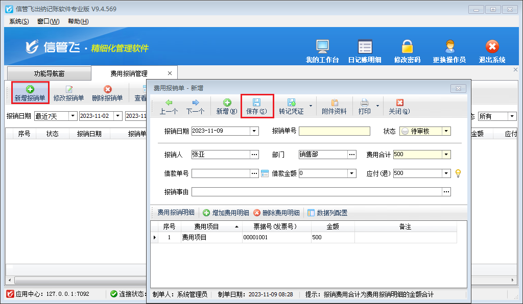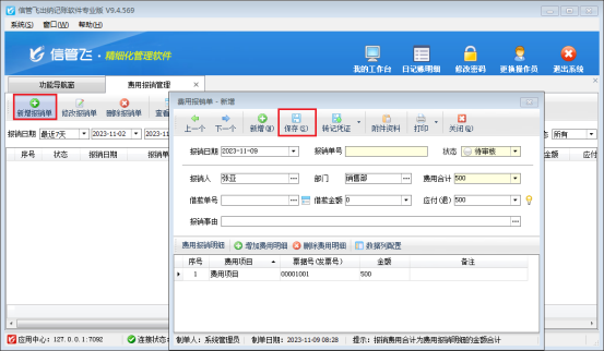 在功能導航窗點擊“綜合管理”—》“費用報銷管理”打開費用報銷管理界面,新增錄入報銷單之后點擊保存按鈕,如圖所示: