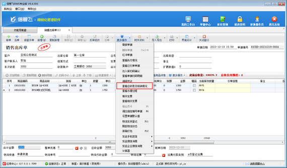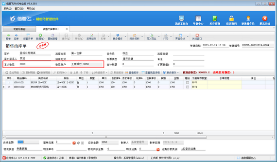 在功能導航窗點擊“銷售管理”—》“銷售出庫單”,打開銷售出庫單界面,新增一個銷售出庫單,并錄入本次收款金額,然后保存并審核銷售出庫單,如下圖所示:
