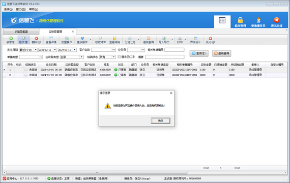 信管飛送貨單軟件支持設置多個操作員并對操作員賬號設置操作權限,有用戶登錄軟件無法修改應收款信息,系統(tǒng)彈出提示“當前記錄為其它操作員錄入的,您沒有權限修改!”,如下圖所示。