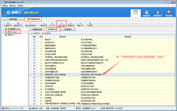 解決方法如下:使用系統(tǒng)管理員賬號登錄軟件,在功能導航窗點擊“系統(tǒng)管理”—》“操作員及授權”打開操作員管理及授權界面,選擇操作員賬號,在“其他操作權限”界面將“可修改其他人員錄入的應收款”權限勾選上,然后保存權限設置,如下圖所示: