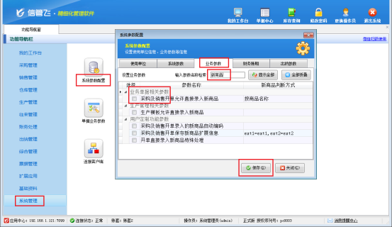 在功能導航窗點擊“系統管理”—》“系統參數配置”—》“業務參數”,即可進入到“業務參數”配置界面,在業務單據相關參數內取消勾選“采購及銷售開單允許直接錄入新商品”參數,然后點擊“保存”按鈕保存設置,如下圖所示: