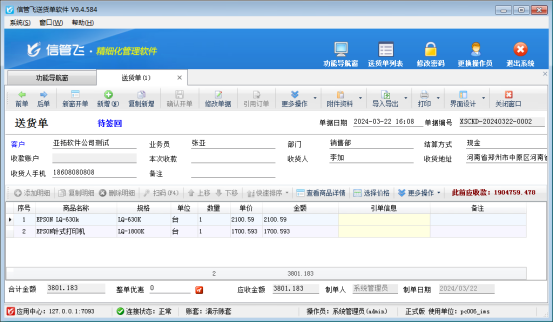 本文以“信管飛送貨單軟件”為例,示范下打印模板如何設置金額四舍五入保留兩位小數(shù),打開一個送貨單,金額存在小數(shù),打印預覽圖如下: