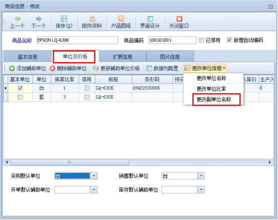 在功能導航窗點擊“基礎資料”—》“商品信息”,在商品信息界面點擊“修改”,點擊“單位及價格”界面。在更改單位信息下點擊“更改副單位名稱”,如下圖所示: