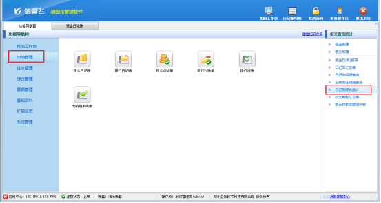 在功能導航窗點擊“出納管理”—》“現金日記賬”,新增日記賬憑證時需要輸入“輔助項目”,然后在“出納管理”模塊最右側的“相關查詢統計”內點擊“日記賬綜合統計”,如圖所示。