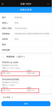在外部客戶界面設計,單據明細項取消勾選單價和金額,然后點擊保存按鈕,接收訂單消息詳情不能查看單價和金額,如圖所示: