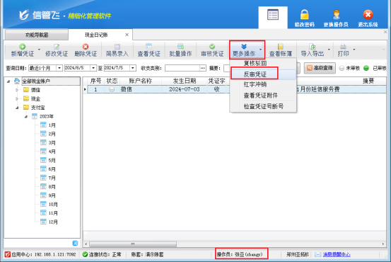 信管飛出納記賬軟件中支持反審憑證,憑證已審核后如發(fā)現(xiàn)填寫錯(cuò)誤,可以反審憑證,反審后,憑證狀態(tài)恢復(fù)為未審核狀態(tài),可以繼續(xù)對(duì)這個(gè)憑證進(jìn)行修改操作,然而,部分用戶反饋,在使用操作員賬號(hào)登錄時(shí),可能會(huì)遇到無(wú)法對(duì)已審核憑證執(zhí)行反審并修改的問(wèn)題。切換系統(tǒng)管理員登錄,可以正常對(duì)憑證進(jìn)行修改,這是由于操作員沒(méi)有反審日記賬憑證導(dǎo)致的,本文以“信管飛出納記賬軟件”為例進(jìn)行示范。