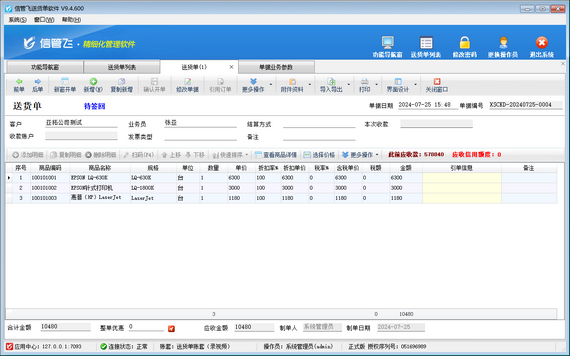 信管飛送貨單軟件采用先進的智能化技術(shù),將繁瑣的手寫送貨單過程簡化為幾個簡單的操作步驟。用戶只需在軟件中輸入客戶信息、商品詳情等基本信息,系統(tǒng)即可自動生成標準、清晰的送貨單據(jù)。此外,軟件還支持自定義打印模板功能,企業(yè)可根據(jù)自身需求調(diào)整送貨單的格式和內(nèi)容,確保單據(jù)的規(guī)范性和專業(yè)性。