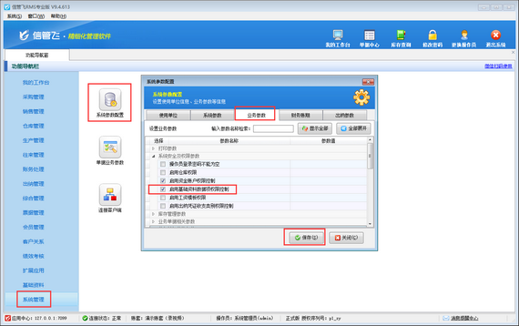 首先需要啟用基礎(chǔ)資料數(shù)據(jù)項(xiàng)權(quán)限控制參數(shù),在功能導(dǎo)航窗點(diǎn)擊“系統(tǒng)管理”—》“系統(tǒng)參數(shù)配置”—》“業(yè)務(wù)參數(shù)”打開(kāi)業(yè)務(wù)參數(shù)配置界面,然后在系統(tǒng)安全及權(quán)限參數(shù)內(nèi)勾選啟用“啟用基礎(chǔ)資料數(shù)據(jù)項(xiàng)權(quán)限控制”參數(shù),然后點(diǎn)擊“保存”按鈕保存參數(shù)配置,如下圖所示。