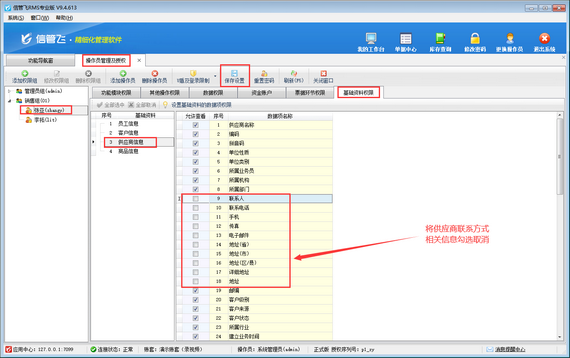參數(shù)設(shè)置完成后,用系統(tǒng)管理員賬號(hào),在功能導(dǎo)航窗點(diǎn)擊“系統(tǒng)管理”—》“操作員及授權(quán)”打開(kāi)操作員管理及授權(quán)界面,選擇操作員賬號(hào),然后在“基礎(chǔ)資料權(quán)限”界面將供應(yīng)商聯(lián)系方式相關(guān)信息勾選取消,如下圖所示。