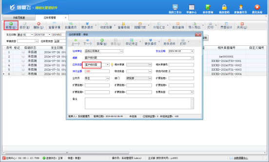 在功能導航窗點擊“往來管理”—》“應收款管理”打開應收款管理界面,點擊“新增”按鈕,新增一筆客戶預付款,錄入摘要,預付金額(預付金額為負數)等信息,點擊保存按鈕即可,如下圖所示: