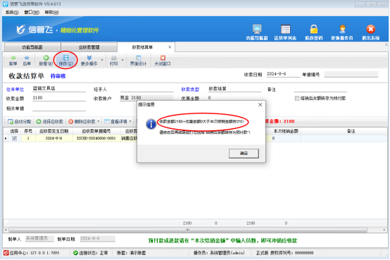 客戶收款結(jié)算后保存時提示“收款金額 優(yōu)惠金額大于本次結(jié)銷金額合計”,保存不了,如下圖所示,如何解決?
