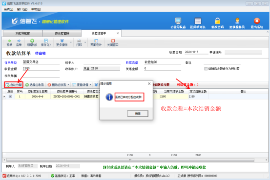 出現(xiàn)此提示原因是僅輸入了“收款金額”,沒有把收款金額分配到對應(yīng)明細(xì)項的“本次結(jié)銷金額”中,軟件支持“自動分配”功能,輸入收款金額后點擊“自動分配”,可自動分配金額到“本次結(jié)銷金額”中,可方便有多條應(yīng)收款明細(xì)時快速操作。如下圖所示: