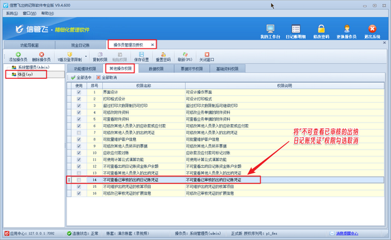 解決方法如下:使用系統管理員賬號登錄軟件,在功能導航窗點擊“系統管理”—》“操作員及授權”打開操作員管理及授權界面,選擇操作員賬號,在“其他操作權限”界面將“不可查看已審核的出納日記賬憑證”權限勾選取消,然后保存權限設置,如下圖所示。