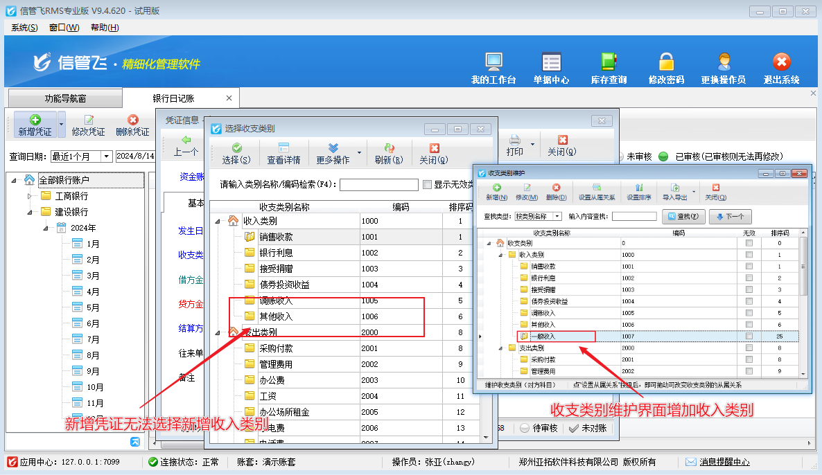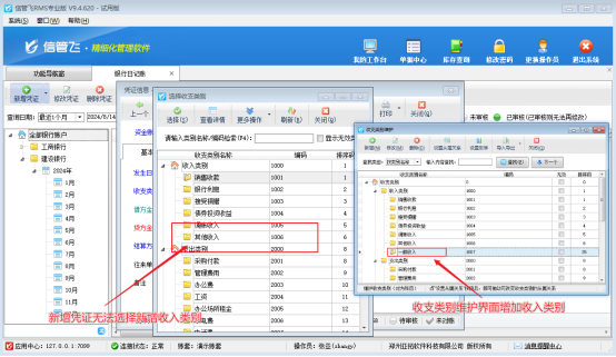 信管飛RMS標準版和專業版支持出納模塊,可登記現金和銀行日記賬,日記賬登記時需要選擇收支類別,支持新增收支類別。操作員新增收支類別后在新增憑證無法選擇新增的收支類別,該如何解決?