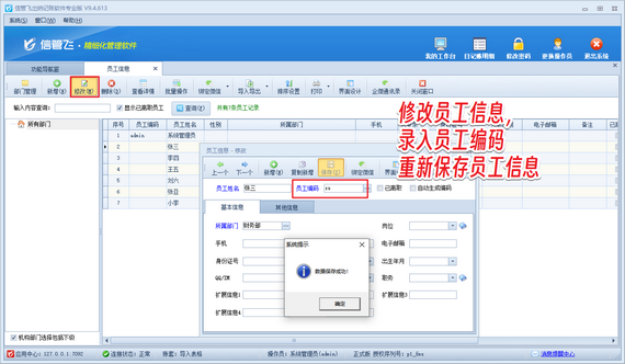 解決方法如下:在功能導航窗點擊“基礎資料”—》“員工信息”打開員工信息管理界面,修改員工信息,補充員工編碼即可。