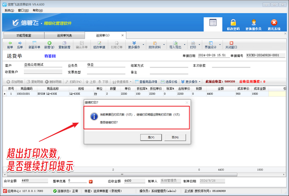 以信管飛送貨單軟件為例,通過簡單設置,即可實現操作員打印次數權限控制。首先,在系統參數中設置打印次數提示;