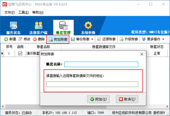 回到賬套管理界面,點(diǎn)擊附加賬套顯示賬套選擇路徑,即可添加賬套