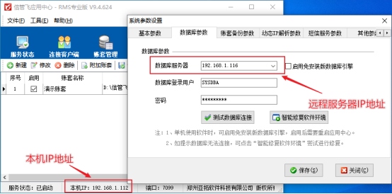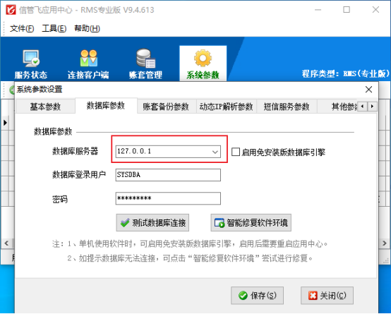 打開應(yīng)用中心界面---系統(tǒng)參數(shù)---數(shù)據(jù)庫參數(shù)界面,數(shù)據(jù)庫服務(wù)器修改為主機(jī)本機(jī)IP地址才可以附加賬套,數(shù)據(jù)庫服務(wù)器可輸入:127.0.0.1