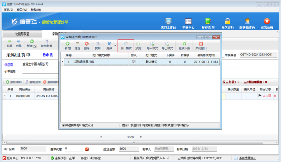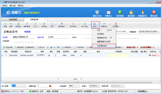 信管飛系列軟件支持自定義設計打印模板格式,打印預覽顯示正常,遇到紙張打印出來內容缺失一部分的問題。以采購退貨單打印模板為例,示范下如何解決打印缺失一部分內容的問題?