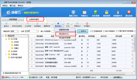 功能導(dǎo)航窗點擊“倉庫管理”,右側(cè)相關(guān)查詢統(tǒng)計下打開“庫存查詢”界面,如果存在多倉庫,先選擇“倉庫”,在工具欄“更多操作”下選擇“導(dǎo)出到Excel”,導(dǎo)出Excel文件,如下圖所示: