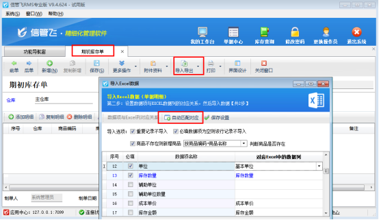 客戶端程序選擇新賬套登錄軟件,新賬套為“未啟用”狀態(tài),功能導(dǎo)航窗點擊“基礎(chǔ)資料”—“期初建賬”,打開“期初庫存錄入”界面。選擇倉庫界面新增“倉庫”并選擇后,點擊工具欄“導(dǎo)入導(dǎo)出”按鈕下的“從Excel導(dǎo)入明細(xì)”,通過復(fù)制導(dǎo)出的Excel文件內(nèi)容,粘貼進(jìn)行導(dǎo)入數(shù)據(jù),下一步對應(yīng)下數(shù)據(jù)項。如下圖所示: