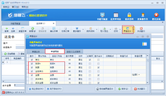 單據(jù)界面,點(diǎn)擊“界面設(shè)計(jì)”,在單據(jù)明細(xì)項(xiàng)勾選顯示稅率、稅額、含稅單價(jià),如圖所示: