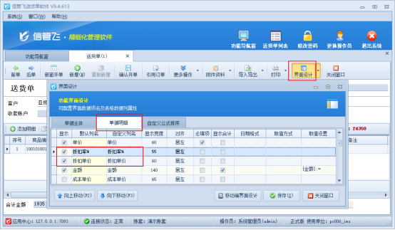 單據(jù)界面,點(diǎn)擊“界面設(shè)計(jì)”,在單據(jù)明細(xì)項(xiàng)勾選顯示折扣率、折扣單價(jià),如圖所示:
