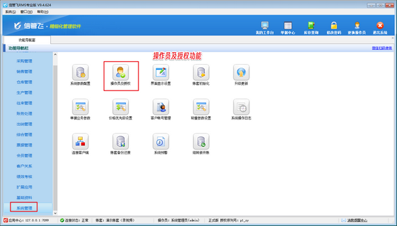以信管飛RMS為例,軟件支持為多個操作員設置賬號,并詳細劃分權限。對于不希望員工查看的商品成本價格,設置過程簡單明了。只需在功能導航窗選擇“系統管理”進入“操作員及授權”界面,輕松取消對應賬號的“查看商品成本價”權限。