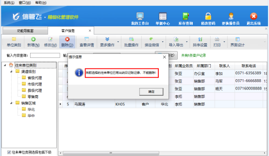 信管飛軟件刪除沒有開單的客戶信息時(shí)提示“當(dāng)前選擇的往來單位已有出納日記賬記錄,不能刪除”,如何解決?如下圖所示: