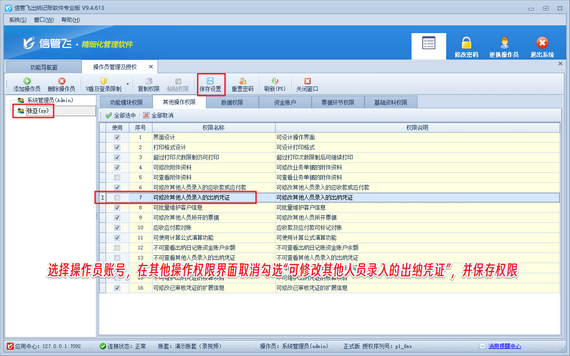 系統(tǒng)管理員登錄軟件后,進(jìn)入“系統(tǒng)管理”—》“操作員及授權(quán)”界面,選擇目標(biāo)操作員賬號。在“其他操作權(quán)限”界面取消勾選“可修改其他人員錄入的出納憑證”,保存后權(quán)限立即生效。