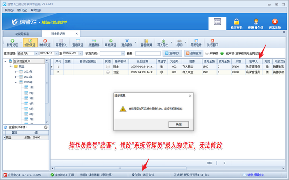 例如,設(shè)置操作員“張亞”不可修改其他人員錄入的出納憑證,操作員“張亞”在修改其他人員錄入的出納憑證時,系統(tǒng)將彈出提示信息“當(dāng)前憑證為其他操作員錄入的,您沒有權(quán)限修改!”。
