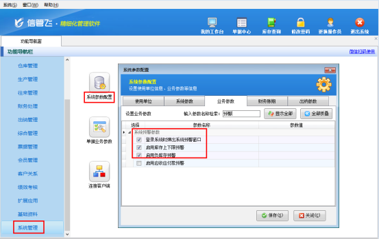 登錄自動(dòng)提示預(yù)警,需要設(shè)置下參數(shù)。功能導(dǎo)航窗點(diǎn)擊“系統(tǒng)管理”,打開“系統(tǒng)參數(shù)配置”,業(yè)務(wù)參數(shù)中啟用以下參數(shù):“登錄系統(tǒng)時(shí)彈出系統(tǒng)預(yù)警窗口”、“啟用庫(kù)存上下限預(yù)警”、“啟用負(fù)庫(kù)存預(yù)警”。如下圖所示: