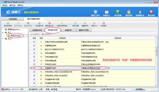在功能導航窗點擊“系統管理”—》“操作員及授權”打開操作員管理及授權界面,選擇操作員賬號,在“其他操作權限”界面將“可查看附件資料”權限取消勾選,然后保存權限設置,如下圖所示。