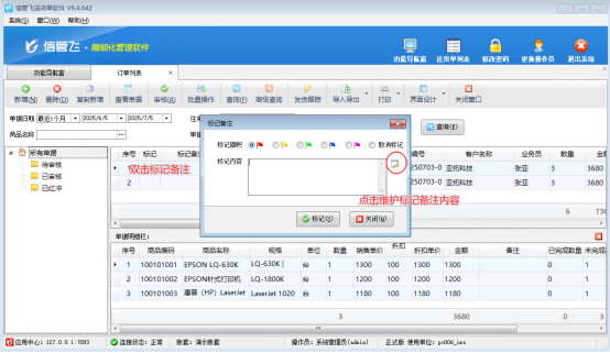 在訂單列表界面雙擊標記備注,點右側標記可以選擇已維護數據字典。