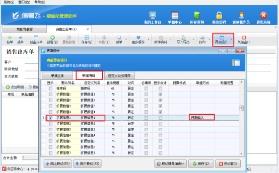 2.進(jìn)入界面設(shè)計(jì)的單據(jù)明細(xì)設(shè)置板塊,勾選需要顯示的擴(kuò)展信息項(xiàng)(如擴(kuò)展信息 1),名稱(chēng)可自定義修改;